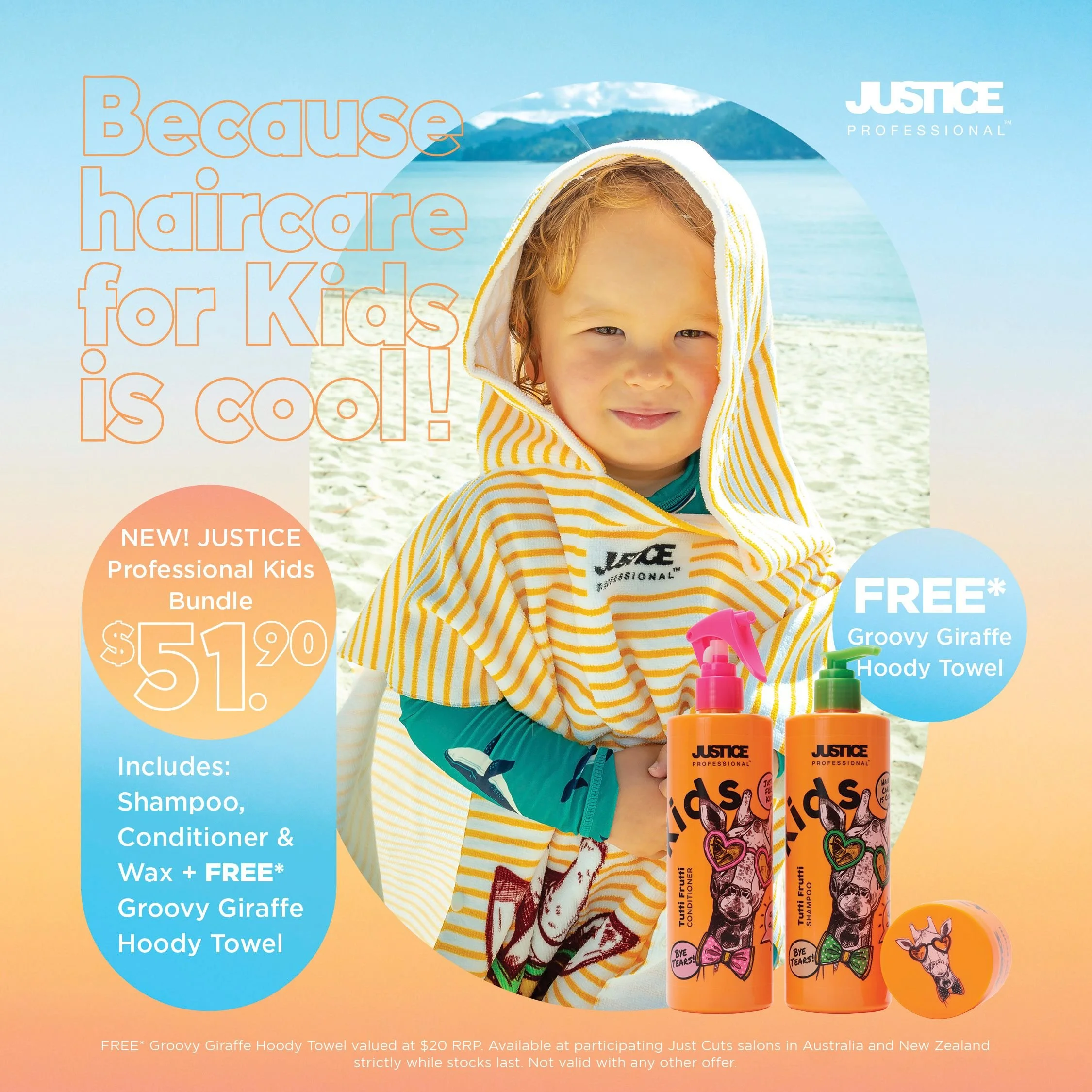 Pick up their Kids bundle at Just Cuts Newton Village Salon and get your FREE Groovy Giraffe Hoody Towel!
